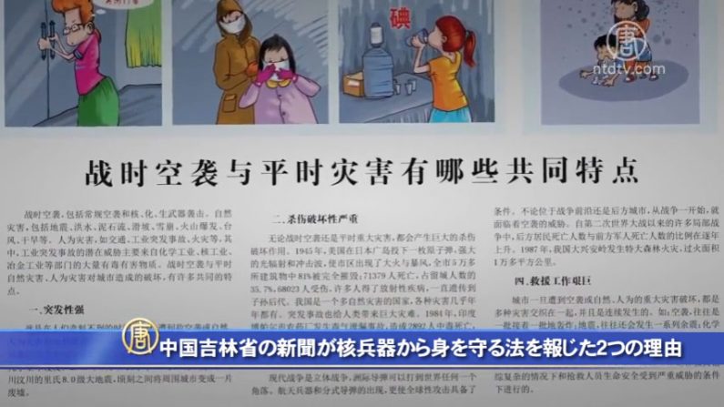 【新唐人2017年12月11日】北朝鮮から近い吉林省の共産党委員会機関紙「吉林日報」がこのほど、核攻撃から身を守る方法について全面を使って報道したのには2つの理由があると見られます。