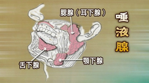 また唾液は三対の唾液腺、つまり耳下腺、顎下腺、舌下腺から分泌される。