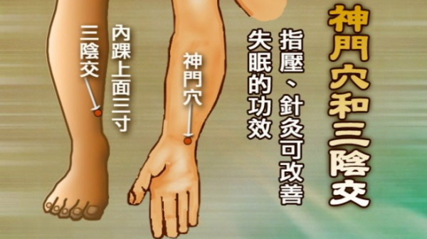 胡先生がご紹介するのは、不眠を和らげるツボである。まず手首の内側にある「神門穴(しんもんけつ)」、足の内くるぶしから指四本分上がったところにある「三陰交(さんいんこう)」。このほかに、髪の生え際や耳元にある「神門穴」など。これらに対し、鍼灸やマッサージをするのだ。