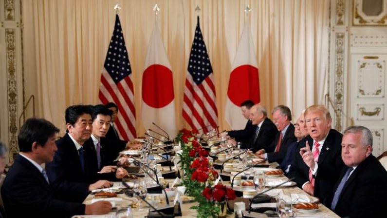 6月4日、安倍晋三首相は、6日から訪米し日米首脳会談を行うことを明らかにした。写真は4月に行われたトランプ大統領とのワーキングランチ。フロリダ州パームビーチで撮影(2018年 ロイター/Kevin Lamarque)