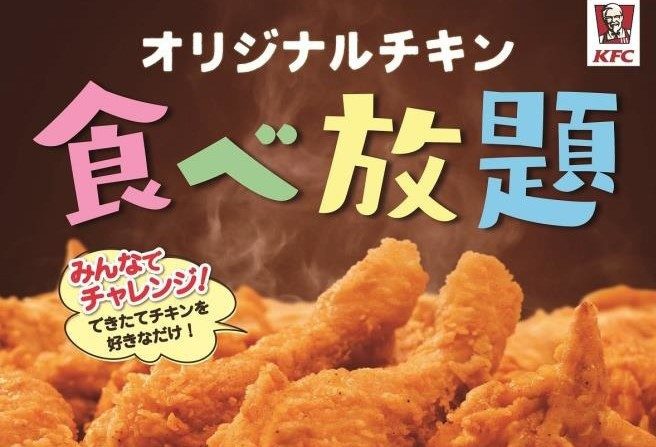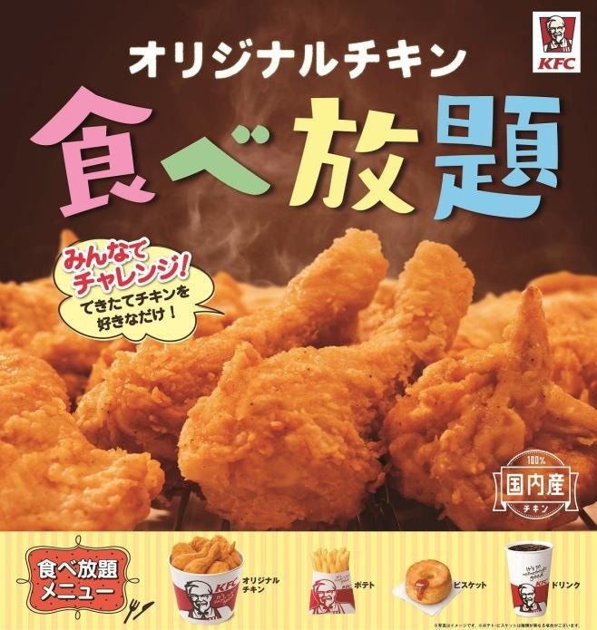 日本ケンタッキー・フライド・チキンは、7月20日から毎週金曜日の午後4時以降、218店舗限定、予約制で『オリジナルチキン』食べ放題のキャンペーンを実施しています。料金は1380円、小学生は980円、小学生未満は無料。