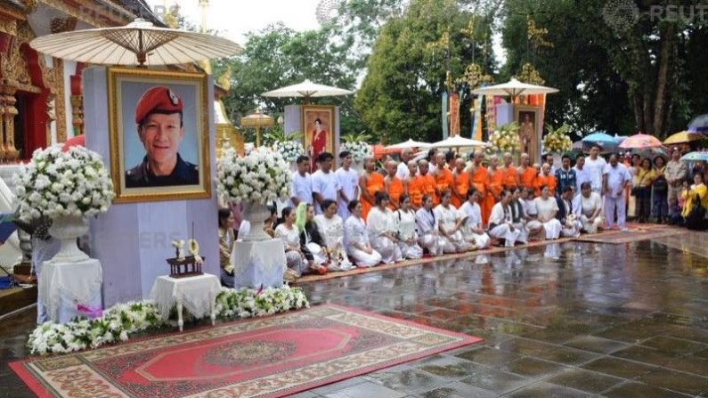 [バンコク 25日 ロイター] – タイ北部チェンライ県のタムルアン洞窟から救出されたサッカーチームの少年11人とコーチが25日、地元の寺院で僧侶見習いとして出家修行を開始した。救出活動中に死亡した元海軍特殊部隊員のダイバー、サマーン・クナンさんを追悼する。