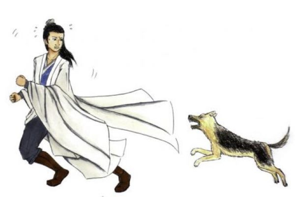 中を見渡していると、突然犬2匹が吠えながら自分をめがけて走ってきました。逃げたい諸葛亮は木戸を開けようとするのですが、開きません。慌てふためきながら逃げ回っていると、下女が犬に走り寄り、犬の頭をポンと叩きました。するとさっきまでものすごい勢いで吠え追いかけてきた犬がパタリと大人しく座りました。 次に下女が犬の耳をねじると、犬は花壇の裏に走り去っていきました。