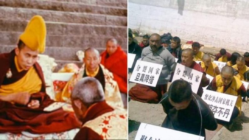 僧侶たちは中国警察から手荒な扱いを受けました。首にかけさせられたプラカードには「分離主義者」と書かれています。