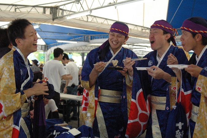 餃子を美味しそうに食べていた、これから出場するという十人十彩の皆さんにインタビュ―。「メンバーは80人で高知から来ました。13時18分に出場します」と元気に答えてくれた。