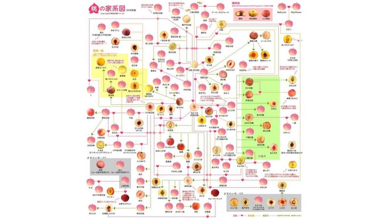 #桃の家系図 2018を公開します。数えたら全部で143品種(写真&イラスト)、そのうち63品種くらいを #桃の断面図 に差し替え、もしくは新たに追加しました。例の通り、クレジット消さなければ自由に無料にお使い頂けます。
