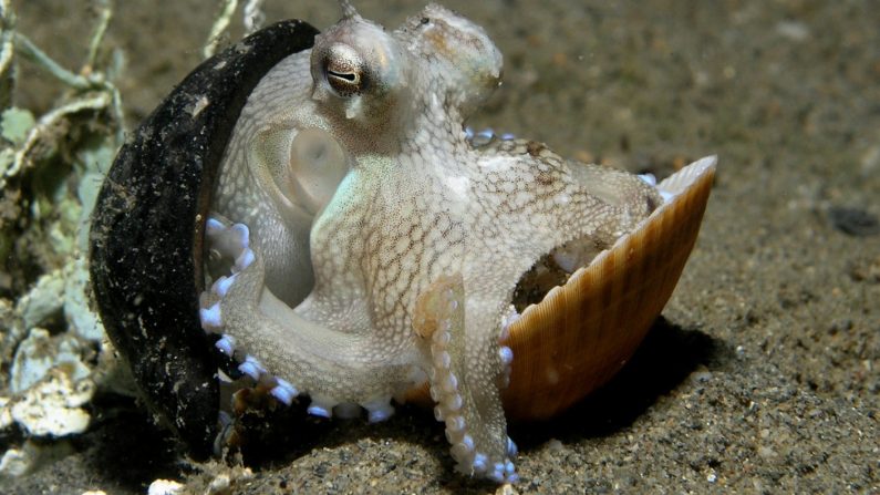 動画のタコはココナッツの殻を抱えたまま移動し、動きを止めると身を丸めて殻の中に入っていきました。道具を使えるタコ、確かに知能の高さがうかがえますね!