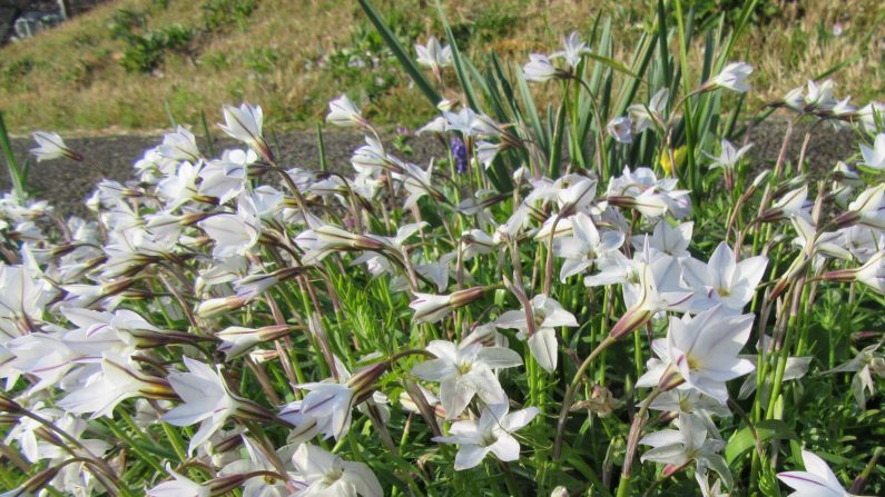 星の形をした小さな花がいっぱい咲いていました。花の名前は花にら。南米が原産地でネギ科の植物だそうです。名前の由来は、葉っぱと球根をこすると、にらの匂いがするからだそうです。