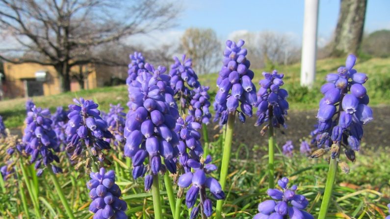 美しい青紫色をした春の花。ブドウの房を逆さまにしたような形からブドウヒヤシンスとも呼ばれるそうです。花の色は他に白・黄・ピンクもあります。原産地は地中海沿岸地、西アジアのユリ科の植物。