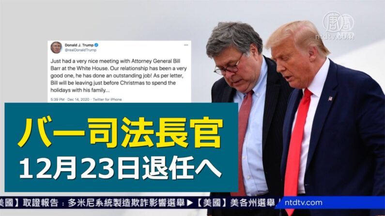トランプ大統領は14日夜、ツイッターでウィリアム・バー司法長官が12月23日に退任すると明らかにしました。