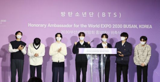 BTS는 오는 10월 15일 부산 기장군 일광 특설무대에서 2030부산세계박람회 유치 기원 콘서트 ‘BTS 옛 투 컴 인 부산(BTS Yet To Come in BUSAN)’을 개최한다.
