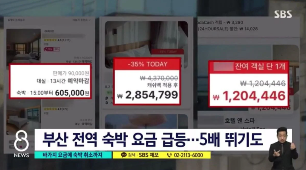 공연 기간 내 부산 지역의 숙박 요금이 적게는 2배에서 많게는 10배까지 폭등한 상황이다.