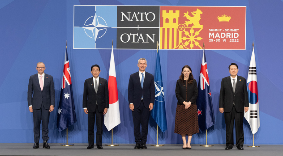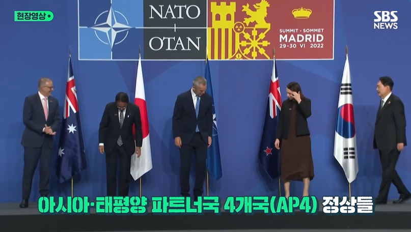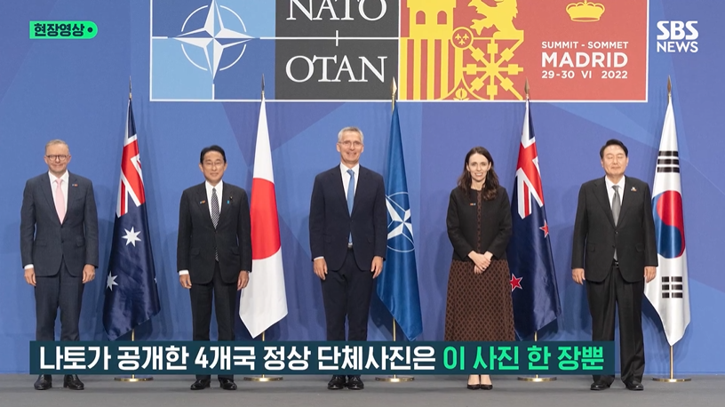 29일(현지시각) 나토 공식 홈페이지에는 윤 대통령이 스페인 마드리드에서 열린 나토 정상회의 중 옌스 스톨텐베르그 나토 사무총장, 기시다 후미오 일본 총리, 앤서니 앨버니지 호주 총리, 저신다 아던 뉴질랜드 총리 등과 아시아 태평양 파트너 4개국 자격으로 함께 찍은 사진이 게재됐다.