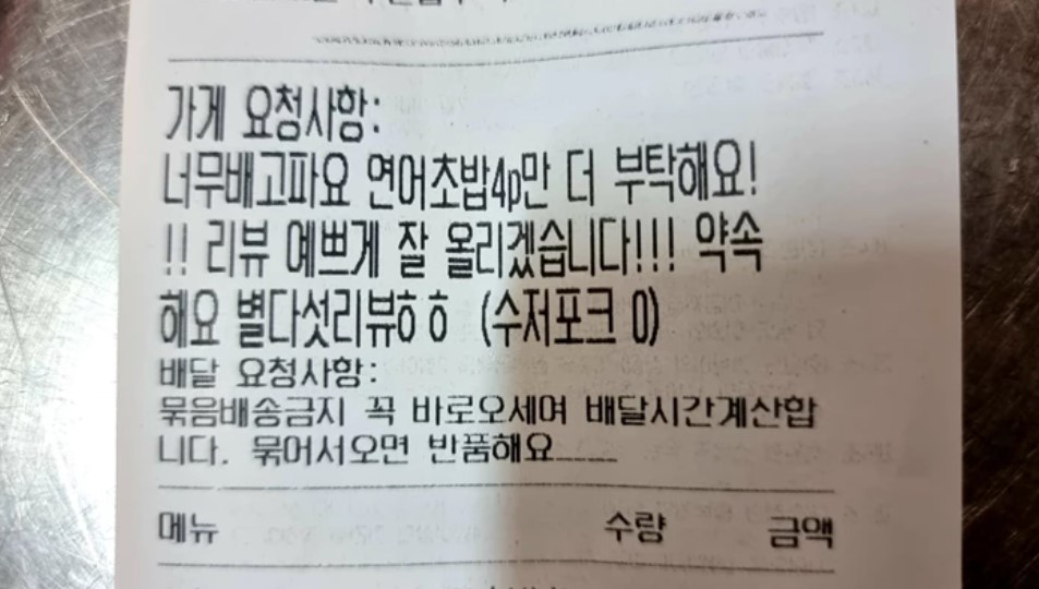 고객은 가게 요청사항에 “너무 배고파요. 연어초밥 4P만 더 부탁해요”라며 “리뷰 예쁘게 잘 올리겠습니다. 약속해요. 별다섯리뷰ㅎㅎ”라고 적었다.