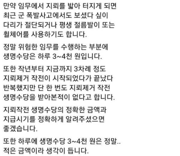 A 장병은 “임무에서 지뢰를 밟아 터지게 되면 다리가 절단되거나 평생 절름발이가 된다. 아니면 휠체어를 타게 된다”라며 “별도로 부여된 위험 임무임에도 수당이 너무 적다”라고 토로했다.