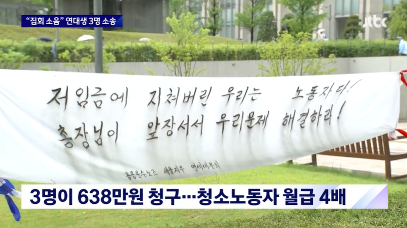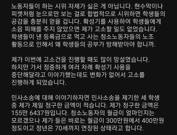 그러면서 “소송을 제기한 세 학생 중 제가 제일 청구한 금액이 적다. 제가 청구한 금액은 155만 6437원이다. 청소노동자의 월급이 얼마인지는 모르겠지만, 제가 들은 바로는 월급이 300만원에서 400만원 정도이고, 정년은 70세까지 연장된 상태라고 한다”며 “여러분들 수업 장소 바로 앞에서 이런 수준의 소음을 발생시키는 게 합당한지 생각해보시기를 바란다”고 덧붙였다.