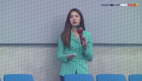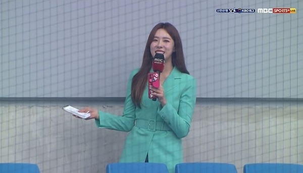 이날 현장 중계에 나선 이유빈 아나운서 역시 관중석에서 제작진의 ‘큐’ 신호를 기다리고 있었다.