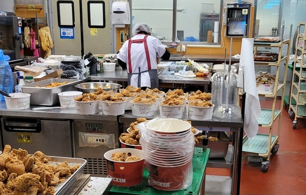 조리 직원들은 위생복, 위생모를 착용한 채 깔끔하게 치킨을 만들고 있다.