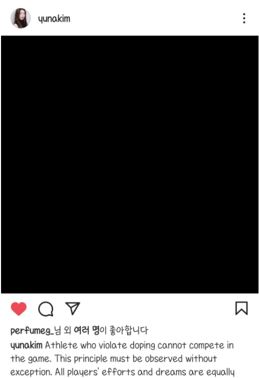 김연아는 14일 자신의 인스타그램에 검은색 이미지와 함께 영문으로 작성된 메시지를 올렸다.