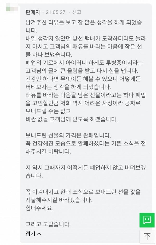 사장님은 “쾌유를 바라는 마음에 작은 선물을 하나 보냈습니다. 폐업의 기로에서 아이러니하게도 투병 중이시라는 고객님의 글에 큰 울림을 받고 다시 힘을 냅니다. 건강만 하다면 무엇이든 해 볼 수 있으니 어떻게든 버텨보자는 생각을 하게 되었습니다”라고 댓글을 남겼다.