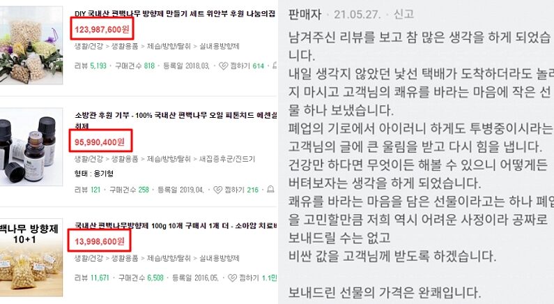 암 투병 중인 고객에게 남긴 따뜻한 댓글로 누리꾼들에게 ‘돈쭐’나고 있는 편백나무 방향제 사장님의 근황이 전해졌다.