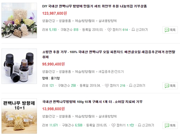 현재 네이버 쇼핑에서 ‘편백나무 방향제’를 검색해서 가격순으로 정렬하면 무려 1억 원이 넘는 편백나무 방향제를 목격할 수 있다.
