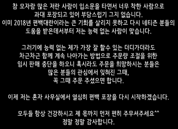 사장님은 “어려운 시국에 주문 주셔서 정말 감사드린다. 올해 1월쯤부터 시작된 매출 하락이 5월까지 이어지며 개인적으로 정말 힘들고 고민 많은 시기를 보내고 있었다”고 고백했다.