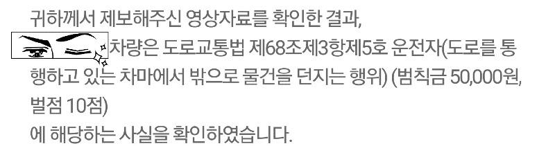 해당 운전자의 행위는 ‘도로를 통행하고 있는 차마에서 밖으로 물건을 던지는 행위’에 해당해 범칙금 5만 원과 벌점 10점을 부과할 수 있다는 것.