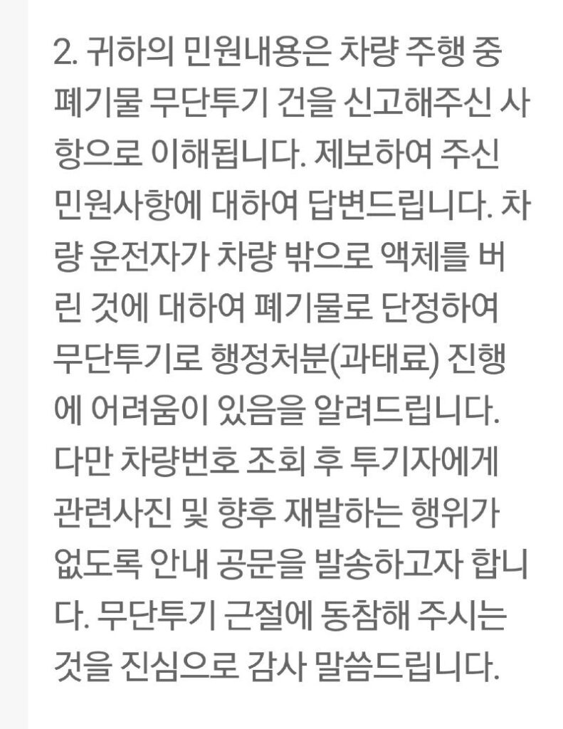 실제로 지자체는 A씨에게 “차량 운전자가 밖으로 액체를 버린 것에 대해 폐기물로 단정해 무단투기로 행정처분(과태료) 진행에 어려움이 있음을 알려드린다”라고 답했다.
