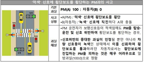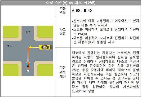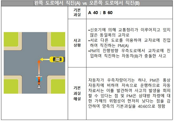 신호기가 없는 동일 폭 도로의 교차로에서 PM이 오른쪽에서 진입한 자동차와 충돌하는 사고가 날 때 PM과 차량의 책임은 각각 40대 60으로 배분됐다.