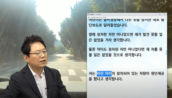 한 변호사는 “신호등이 없는 횡단보도에서는 정차했다 가야 한다”며 “불법 주정차 차량 때문에 보이지 않지만 ‘멈췄다’ 가야 했다. 그러니 횡단보도 사고가 맞다”고 설명했다.