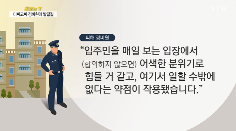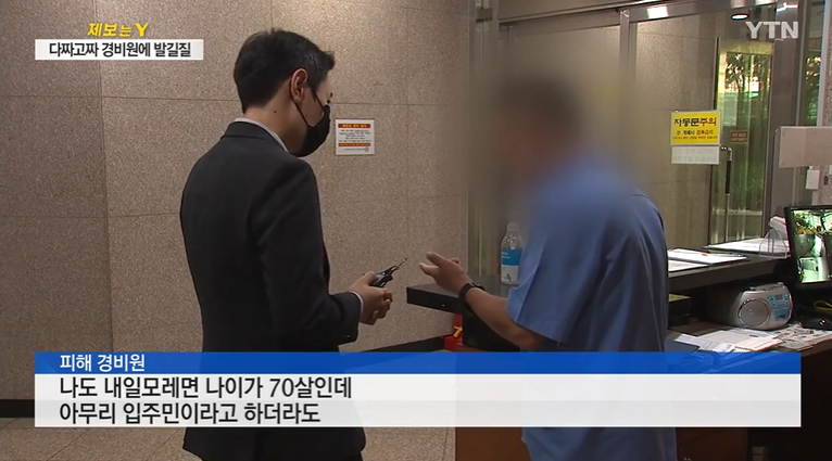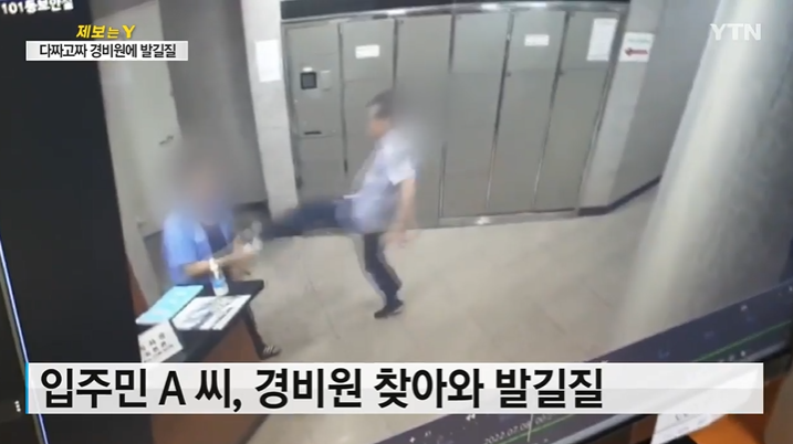 18일 YTN 뉴스는 입주민에게 발길질을 당하고도 결국 합의를 할 수밖에 없었던 경비원의 사연을 전했다.