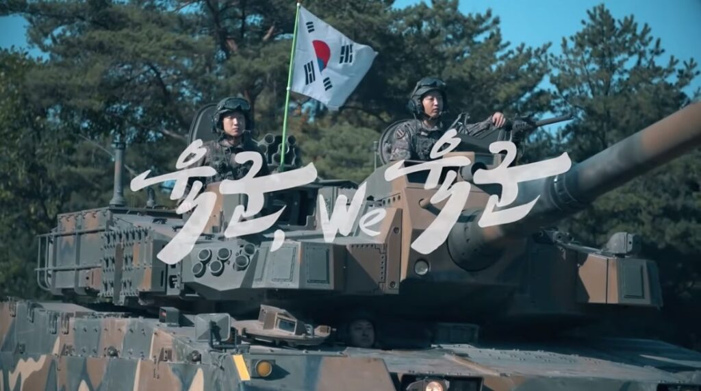 곧 전통악기 연주를 배경으로 “육군 아미타이거 육군 육군 육군, Go Warrior Go Victory 육군 육군 육군”이라는 동요 같은 가사가 나왔다.