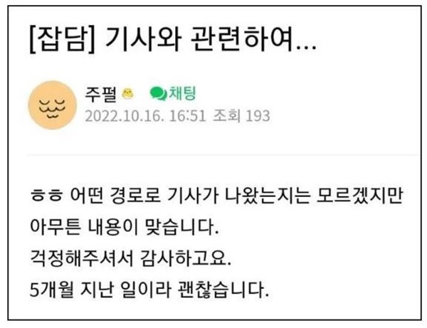 주호민은 “굳이 알릴 일인가 싶어서 말을 안 했는데 기사가 떴더라”면서 “기사에는 A씨로 나오는데, 누가 읽어도 나다. 주변에서 저 아니냐고 물어보길래 맞다고 했다”라고 말했다.