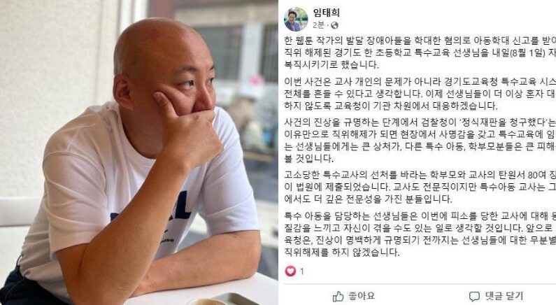 임태희 경기도교육감은 31일 자신의 페이스북 계정에 “한 웹툰 작가의 발달 장애아들을 학대한 혐의로 아동학대 신고를 받아 직위 해제된 경기도 한 초등학교 특수교육 선생님을 내일(8월 1일) 자로 복직시키기로 했다”라고 밝혔다.