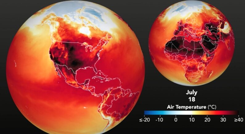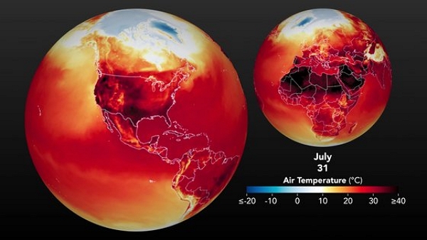 이런 가운데 미 항공우주국(NASA)이 지구 서반구의 7월 최고기온 분포 지도를 공개해 눈길을 끌고 있다.