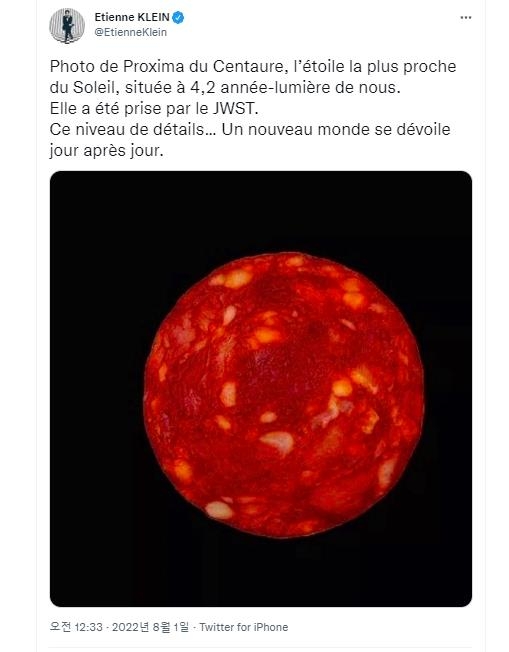 소시지 단면을 찍어 망원경으로 포착한 ‘별 사진’이라고 트위터에 올린 프랑스 유명 물리학자가 논란이 커지자 사과했다.