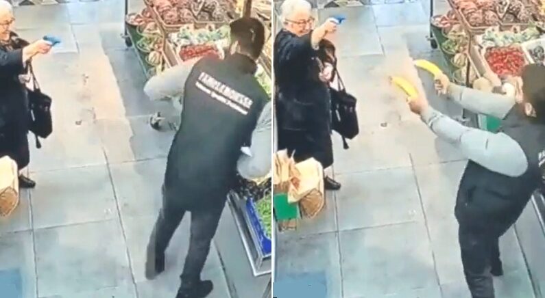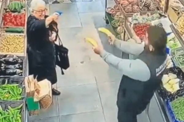 할머니의 총을 발견한 직원은 곧바로 맞섰다. 직원 또한 품에서 무언가를 빼들고 할머니를 향해 겨눴는데, 다름 아닌 바나나 두 개였다.